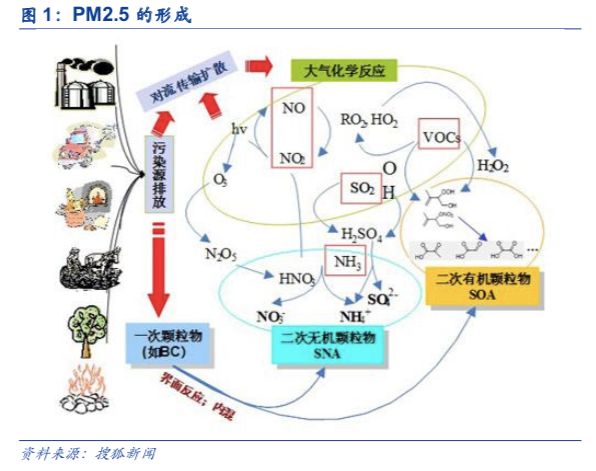 PM2.5有两种来源,一类是自然界、人类活动或污染源直接产生一次排放;另一类则是由大气当中的气态污染物反应生成,如二氧化硫、氮氧化物、VOCs等经过一系列复杂的物理化学反应形成的二次细颗粒。中科院研究表明二次颗粒物是PM2.5最大来源。以我国中东部地区为例,在PM2.5总量当中,约60%都是二次粒子生成的,而成霾时二次颗粒物所占比例往往会更高。