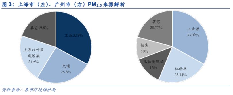 相比之下,上海、广州等地区域传输的贡献相对较小。上海PM2.5污染源主要以工业、交通和区域传输为主,分别占32.9%、25.8%和21.5%;工业污染中,15.4%为工业工艺过程排放、10.2%为工业锅炉和炉窑排放、7.3%为电厂排放。广州空气中的PM2.5来源中,33.09%是工业源(主要为燃煤电厂、工业锅炉等)、23.14%为机动车污染、13%为生物质燃烧、10%为扬尘污染和其他一些污染物。各地PM2.5的污染源具有多样性,需采取不同的控制措施对症下药。
