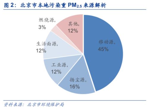 各个地区的PM2.5成因有其区域性特征。据北京市环保局公布的PM2.5源解析研究结果,北京地区本地污染排放贡献占三分之二,区域传输贡献约占三分之一,但是重污染日区域传输贡献超过50%。在本地污染中,机动车、扬尘、工业生产、生活面源(即做饭、取暖燃煤、生物质等居民排放)为主要来源,分别占45%、16%、12%和12%。