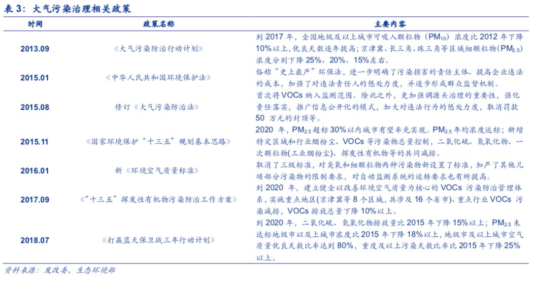 2013年9月,国务院发布《大气污染防治行动方案》(“大气十条”),提出五年内使全国空气质量整体改善。2015年修订《大气污染防治法》将VOCs纳入监测范围;2016年新《环境空气质量标准》对臭氧和细颗粒物两种污染物新设置了标准,并加严了其他几项部分污染物的限制要求;2017年《“十三五”挥发性有机物污染防治工作方案》提出将VOCs排放总量下降10%以上;2018年3月,国务院印发《打赢蓝天保卫战三年行动计划》,明确大气治理的区域和目标,并研究将VOCs纳入环境保护税征收范围。