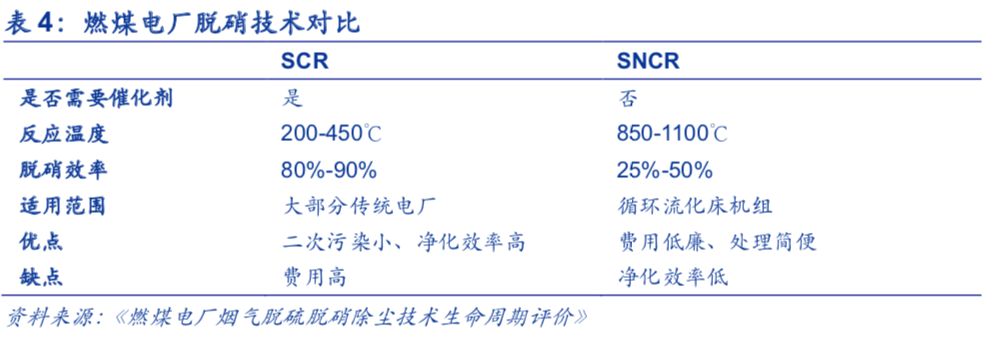 脱硝的方法主要有SCR和SNCR脱硝工艺。SCR即选择性催化还原法,是指在200-450℃时,加入液氨、氨水或者尿素为还原剂,在催化剂的作用下,使得烟气中的氮氧化物发生还原反应,转化为氮气和水,从而减少NOx的排放量。该方法脱硝率一般为80%-90%,净化效率高,技术成熟度高,因而是当前应用最多、技术最成熟的烟气脱硝技术。但是,SCR的催化剂成本高,且使用完后属于危废,将产生后续的处理成本。SNCR即选择性非催化还原法,是指在850-1100℃时,将尿素等氨基还原剂喷入炉膛,在没有催化剂的作用下,氮氧化物与还原剂直接反应生成氮气和水。该方法脱硝效率相对较低,约为25%-50%,但由于不需要使用催化剂,所以使用方法简单,成本低廉,适用于循环流化床锅炉。