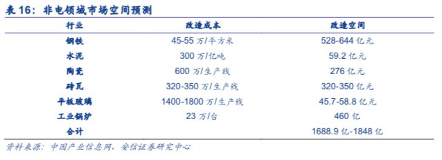 钢铁行业方面,目前全国有待改造的烧结机约900台,烧结机面积约11.6万m2。改造路线分别为:电除尘+半干法脱硫除尘+中温SCR协同净化工艺,单位投资约45万元/m2;电除尘+活性炭协同治理工艺,单位投资约55万元/m2,假设全国范围内均按照特别排放限值进行改造,则总投资约为528-644亿元。
