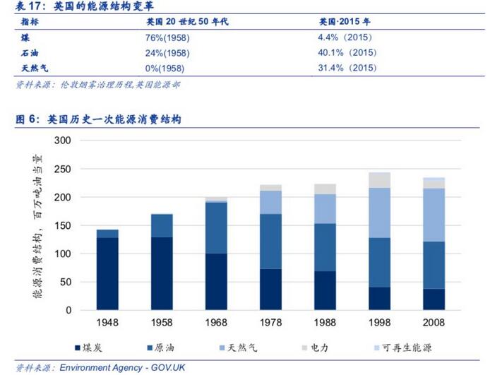 从英国历史的能源供给和消费结构来看,1958-1968年能源结构变革以“油代煤”展开,而1968-1978年主要是进行“气代煤”,1978-1988年则同时发生“气代煤”和“气代油”的进程,1988年之后的将近30年,则主要是进行“气代煤”的能源结构变革。