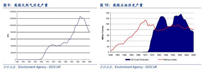 能源结构成功变革与北海油气资源的发现与量产密切相关。北海是大西洋的边缘海,在大不列颠岛和欧洲大陆之间,面积约50多万平方千米,油气资源丰富,海底石油藏量仅次于波斯湾和马拉开波湾而居世界第三位。英国于1965年首次在北海南部发现气田群,1969年发现埃科菲斯克大油田,1971年又发现布伦特大油田,就此进入北海油气资源开发的高潮。北海天然气从1967年开始量产,到1976年的年产量已经达到1.8亿立方米,并在其后5年产量实现了135%的年复合增速。北海的石油开采相对天然气较晚,从1975年开始量产,在北海油田开采以前的1948-1970年,年均石油产量少于15万吨,而北海油田开始量产后,英国石油产量迅速从1976年160万吨扩大到8000万吨。在英国北海油气资源进入开发高峰的时期,世界爆发接连在1979年爆发第二次石油危机,1980年爆发伊朗战争,大幅推高了石油价格,这进一步加速了英国北海油气的开发和利用。