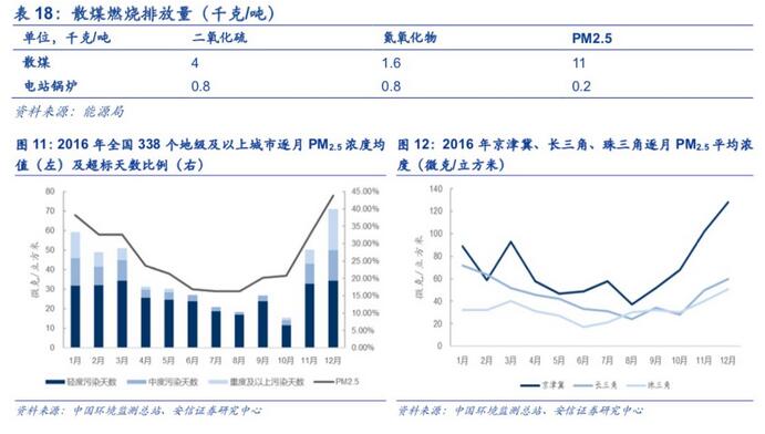 从我国雾霾的地域性和季节性推测,散煤燃烧或是北方冬季雾霾的罪魁祸首。根据《中国采暖炉具行业发展报告2016》披露,在我国1.6亿户农村居民家庭中,采取分散采暖约9300万户,其中燃煤采暖约6600万户,散煤使用量约2亿吨。冬季劣质散煤燃烧造成的污染是巨大的;散烧煤二氧化硫排放达到4千克/吨,而相比之下电站锅炉只有0.8千克/吨;使用散煤产生的一次PM2.5的排放系数为11千克/吨煤,而电站锅炉的则为0.2千克/吨煤,散煤的排放系数远远高于电厂锅炉。
