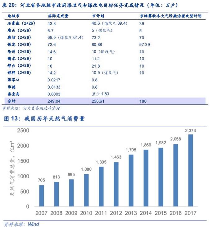 2017年是“大气十条”的第一阶段考核年,因此“煤改气”在2017年加速推进。居民端,京津冀农村地区全面开展“村村通,煤改气”工程。《京津冀2017-2018年秋冬季大气污染综合治理攻坚行动方案》要求北京、天津、河北、山西、山东、河南6省市完成“煤改气”与“煤改电”改造合计355万户,并将改造任务分配落实到省。各地政府都着力加大“煤改气”的实施力度,自加压力设置指标,使得部分地区“煤改气”规模远超目标。以河北省为例,2017年共完成农村“煤改气”、“煤改电”253.7万户,其中“煤改气”231.8万户,远超年初制定的“煤改气”和“煤改电”180万户的总目标,超额40%完成改造任务。